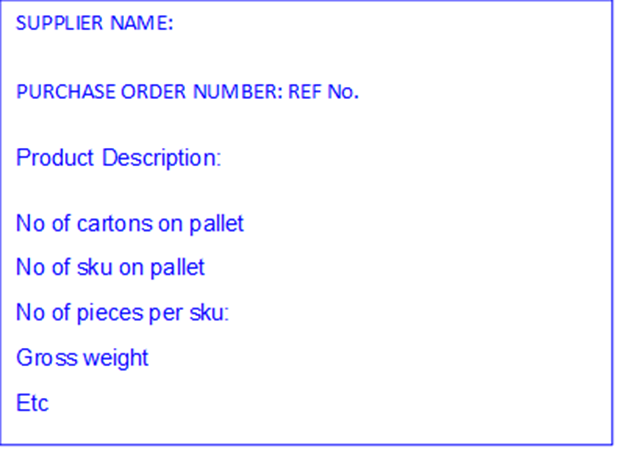 - Ensure all pallets have a standard pallet label (see below) attached to them to avoid unnecessary delays in receiving the goods at the DC.